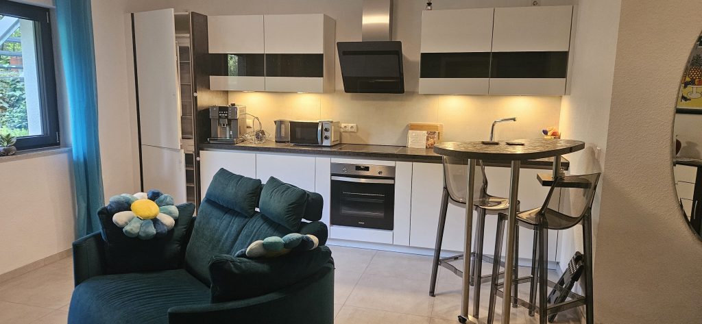 Die Wohnung (45 qm) besteht aus einem Wohn-Esszimmer mit voll eingerichteter Küche (Kühl-u/Gefrierschrank, etc.) 1 Sessel, einem 2er-Schaukel-/Liege-Sofa, LCD-Fernseher mit Satelliten-TV, 2 Couchtischen, Ess-Bar mit 2 Barhockern. Das Schlafzimmer ist mit Kingsize-Bettwäsche, 2 Nachtkonsolen mit Touchscreen Lampen, großem Spiegelschrank, Konsole mit LCD-Fernseher ausgestattet ist. Das exklusive Duschbad /WC mit 2 Spiegeln ist ebenerdig. Die Wohnung bietet Ihnen zwei schöne Außensitzmöglichkeit umgeben von Kräutern, Bäumen und Sträuchern.